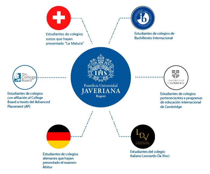 Bajo esta articulación hemos recogido un conjunto de condiciones y procedimientos a seguir para la validación de asignaturas a estudiantes procedentes de Colegios de Bachillerato Internacional, de Colegios pertenecientes a los Programas de Educación Internacional de la Universidad de Cambridge, de Colegios Suizos que hayan presentado la Matura, de colegios con afiliación al College Board a través del Advanced Placement (AP), de Colegios Alemanes que hayan presentado el examen Abitur y del Colegio Italiano Leonardo Da Vinci.